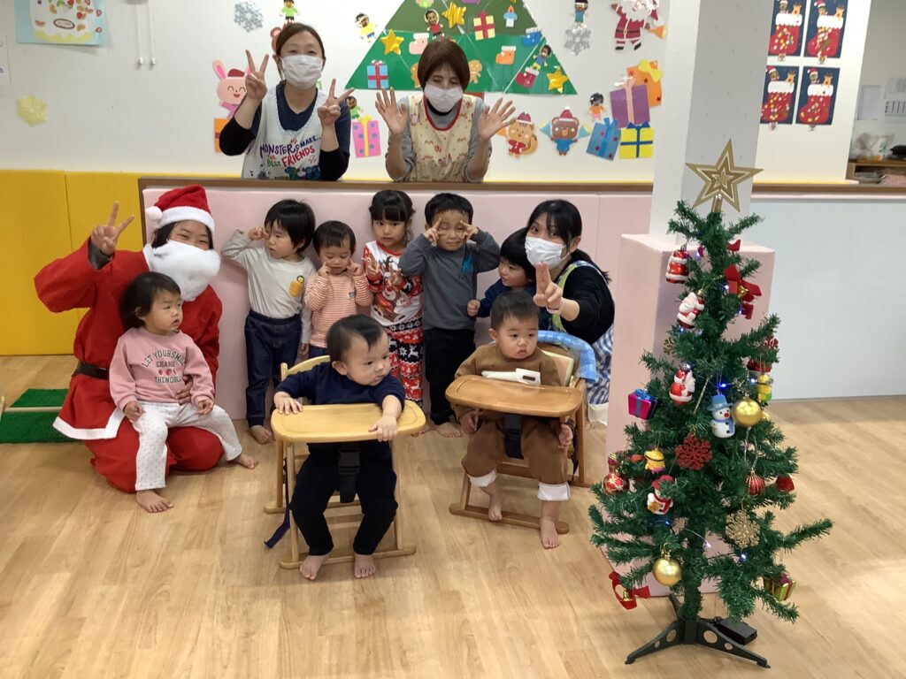 年末には待ちに待ったクリスマス会♡サンタさんからプレゼントをもらって目をキラキラ☆彡お散歩の度にみんなで一生懸命拾い集めた木の実で驚くほどクオリティの高いリースを作って飾る事もできました。