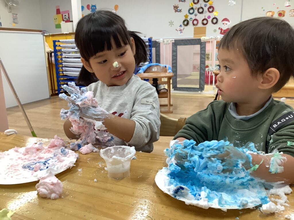 紙ひこうき大会ではお空まで届きそうなはしゃぎ声!シェービング泡モコモコ遊びでは楽しくて楽しくて頭から泡だらけ~。