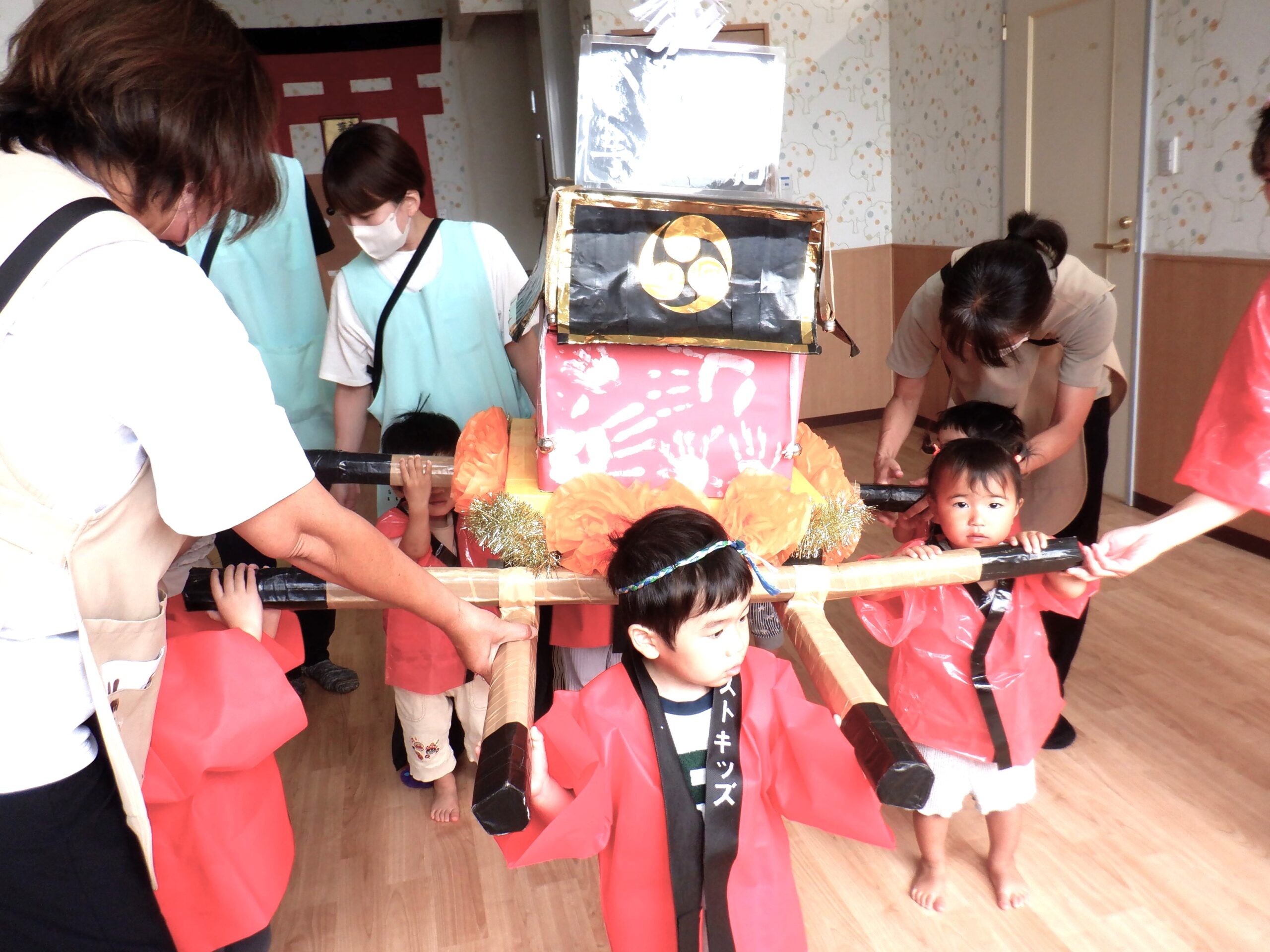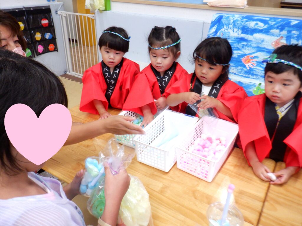 8月下旬、夏祭りを行いました。保護者の方と一緒にゲームをしたり、ぱんだ(2歳児)組はジュース屋さんになったりと、楽しい時間を過ごしました。