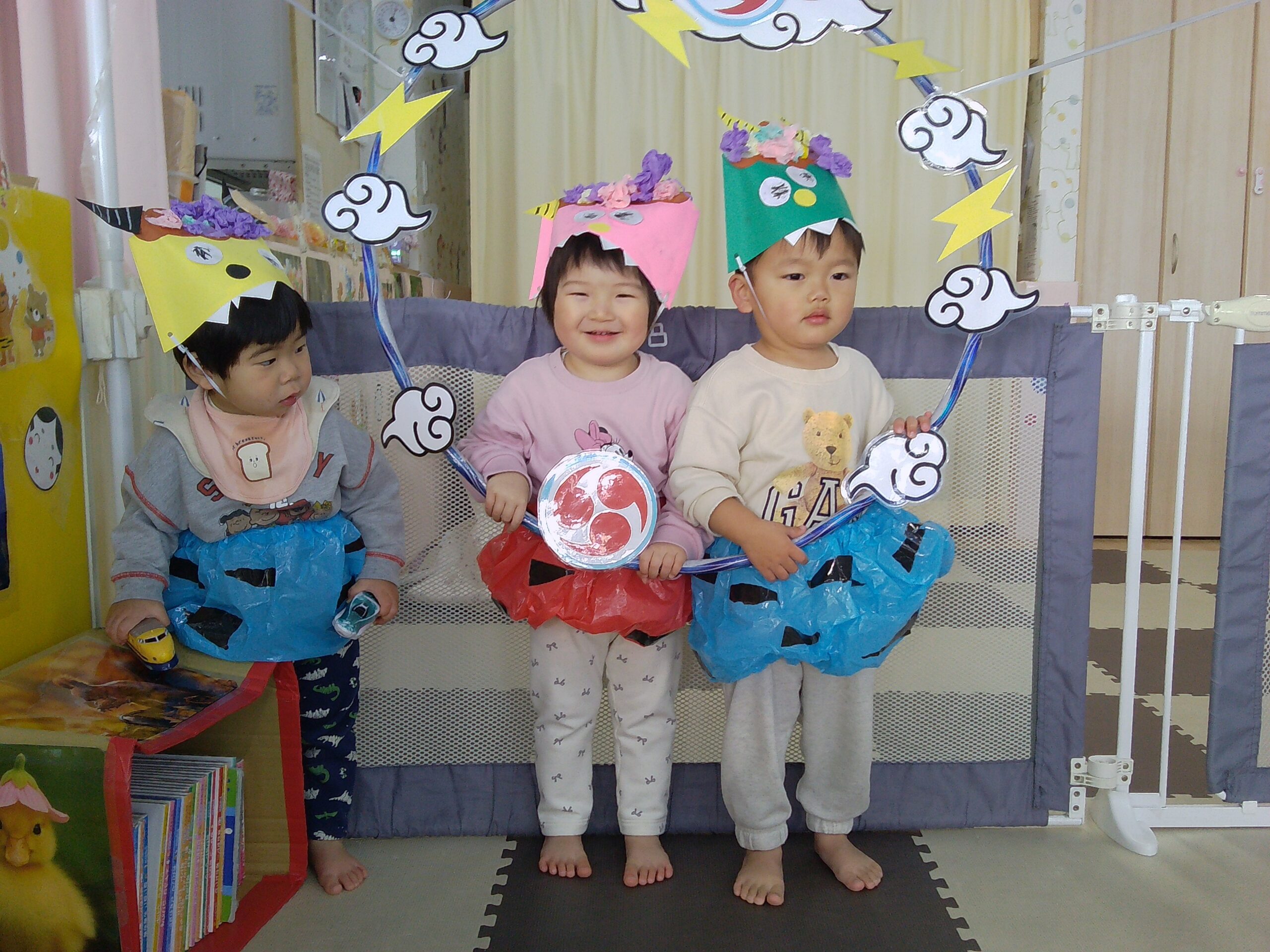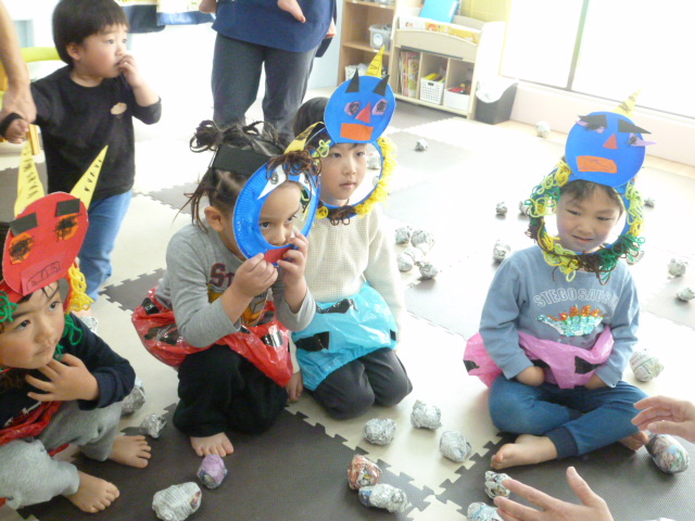 節分祭では、子どもたちが作った鬼のお面をかぶって、「おにはそと、ふくわうち」と元気に新聞紙ボールを投げる子ども達の姿に、行事を通して心も体も成長していることを感じ取ることが出来ました。