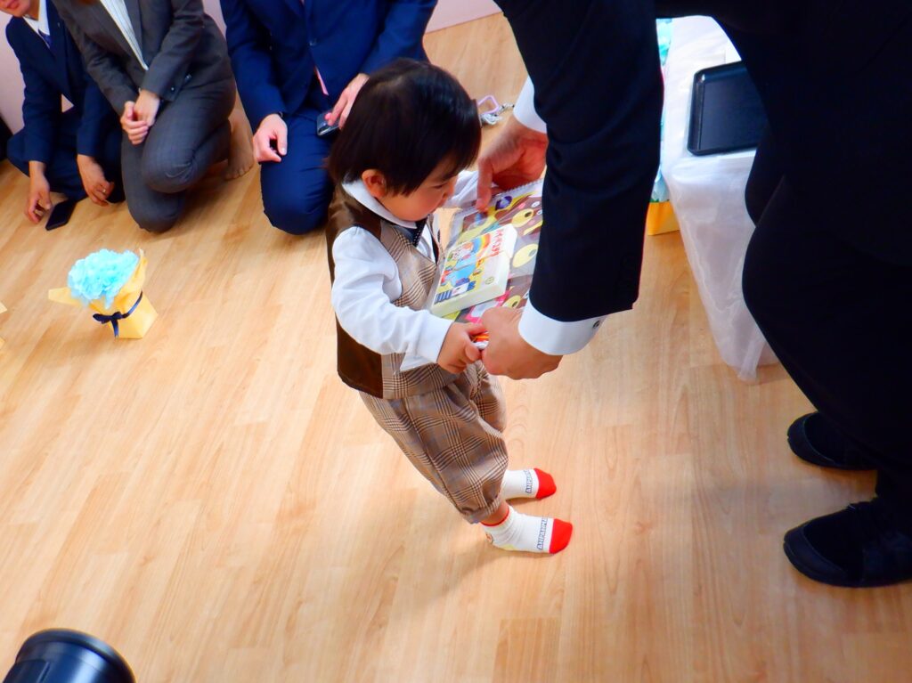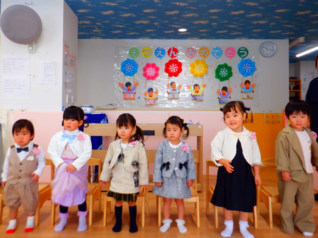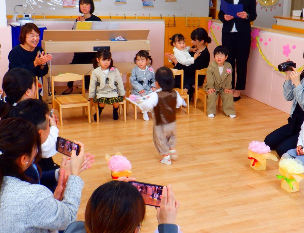 卒園児の2歳児6名は、授与式で名前を呼ばれると「ハイ!」とそれぞれ元気に答え、笑顔で堂々と歩き、証書や記念品を受け取る一人一人の姿に成長を感じ、胸が熱くなりました。