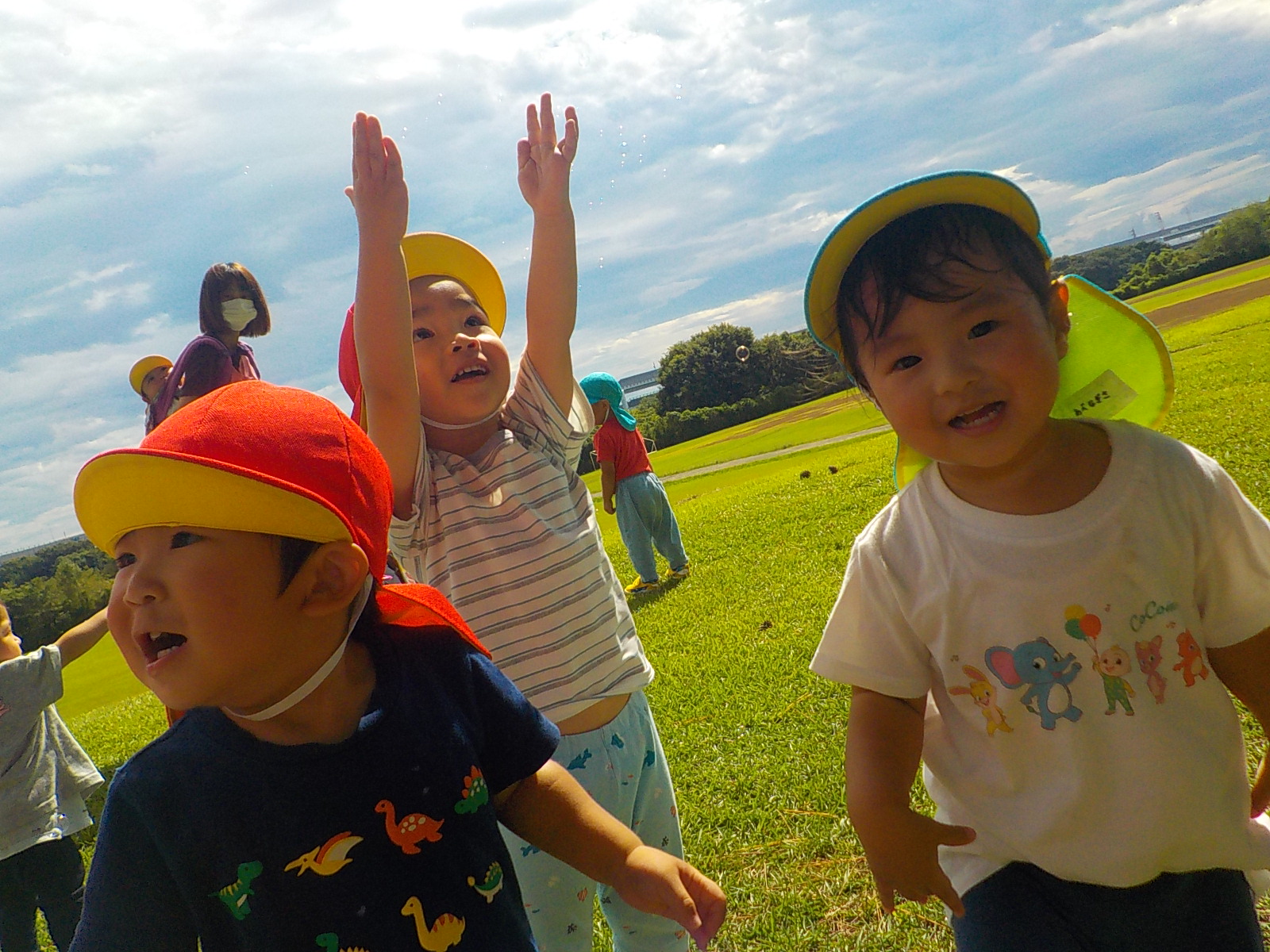 いつも元気一杯の子ども達は天気の良い日に近くの公園や広場に散歩に出かけ、追いかけっこやかくれんぼ、虫探しや落ち葉拾いなど季節にあった遊びを楽しんでいます。