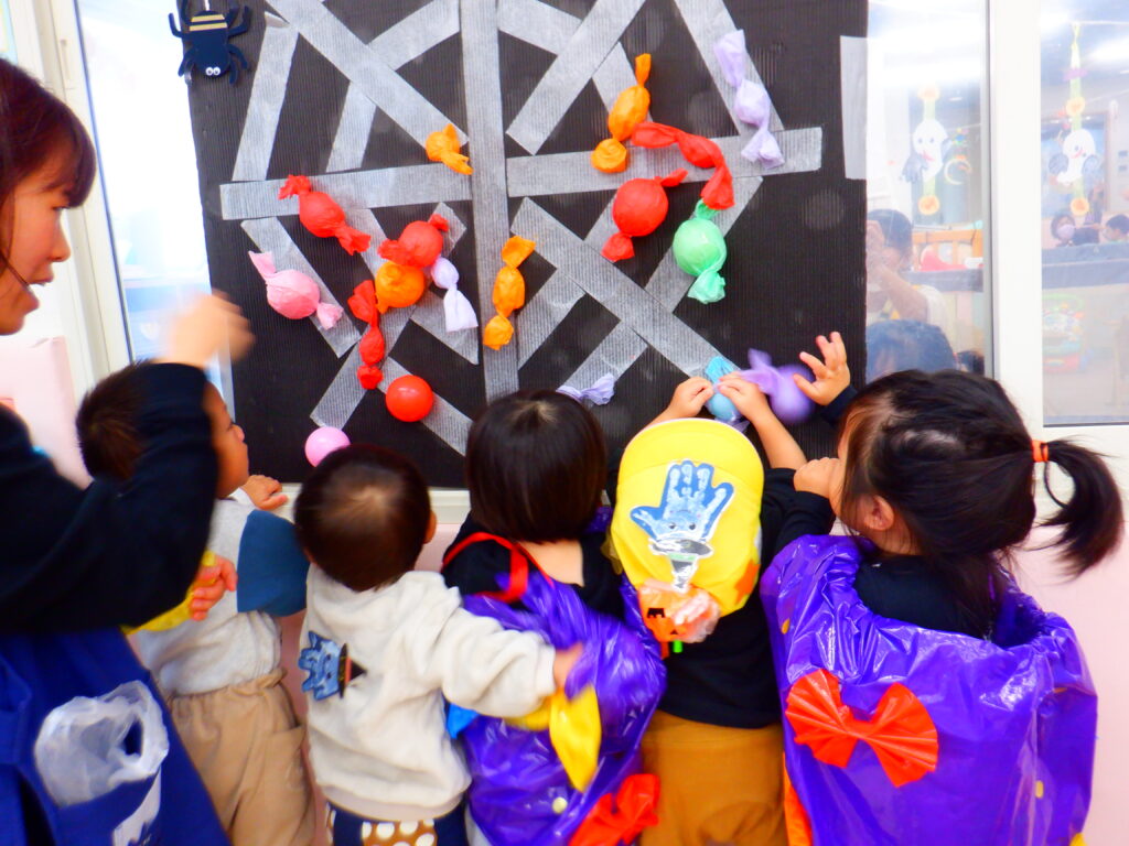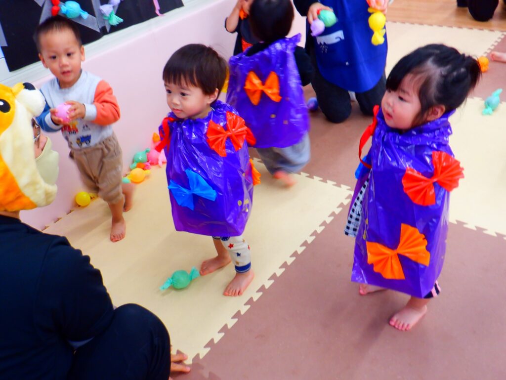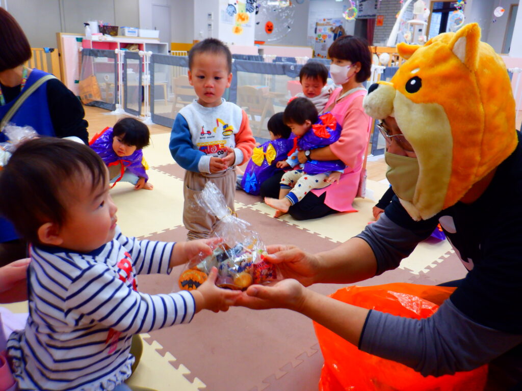 その後「トリックオアトリート」と子ども達みんなで言って「イヌ」から一人ずつお菓子をもらうと、嬉しそうな顔が見られました。