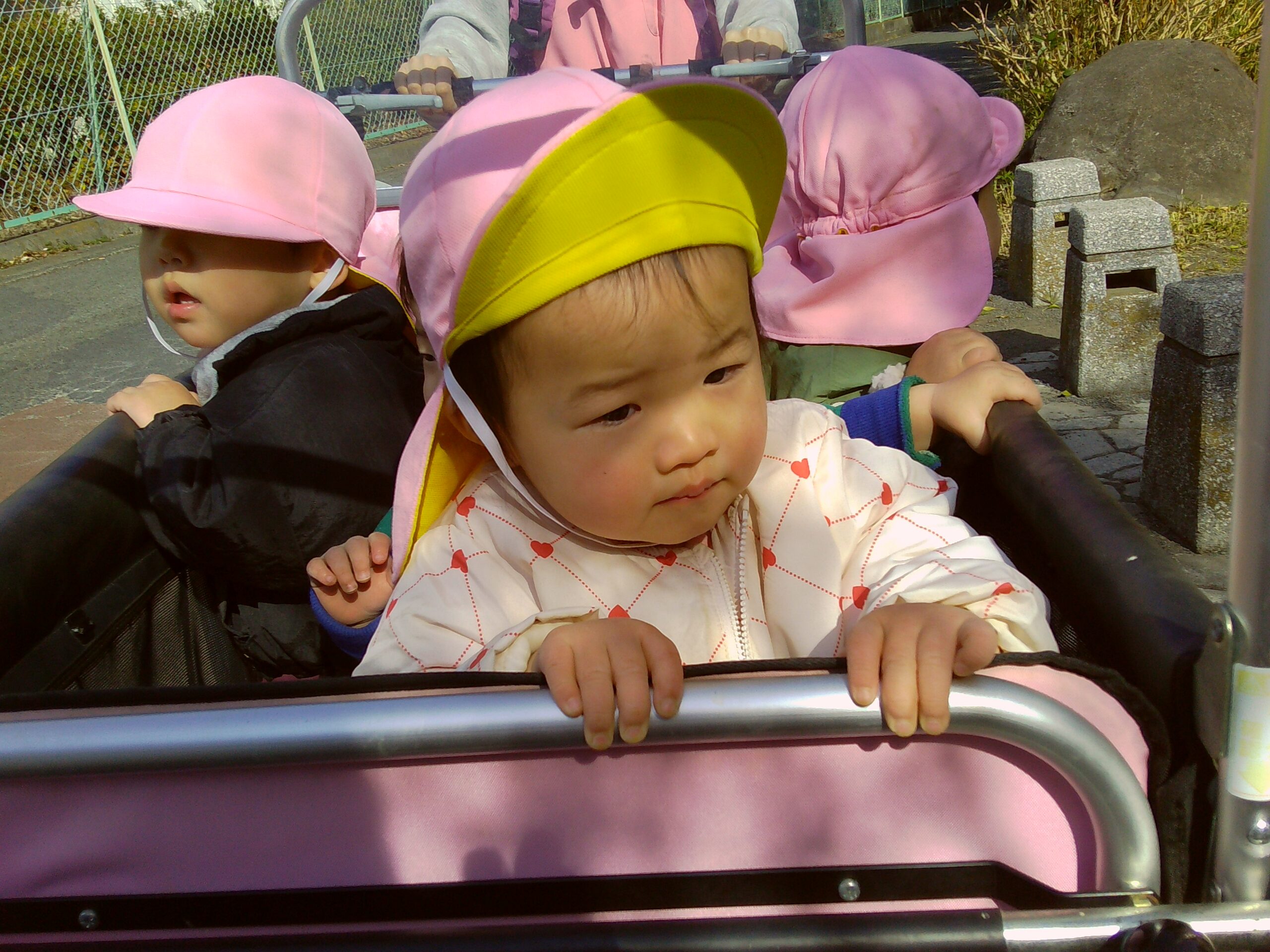 散歩への道中、0歳児さんは座れる散歩車から立ち乗りカートでの移動へ。