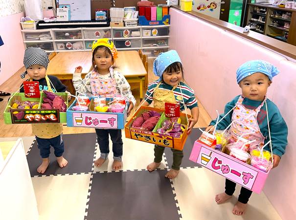 今年は楽しみにしていたお芋堀りが都合で実施出来なくなってしまった為、園では「焼き芋屋さんごっこ」を開催しました♪