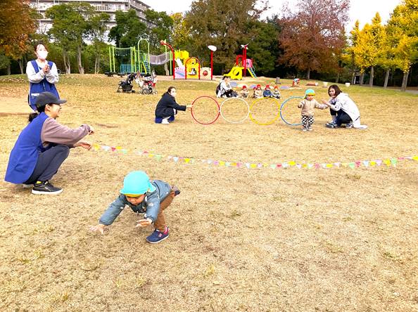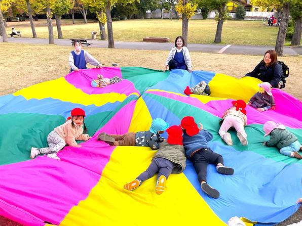 又、近くの公園で「運動会ごっこ」を楽しみ、障害物競走や玉入れ、パラバルーンなど思い切り身体を動かしました。