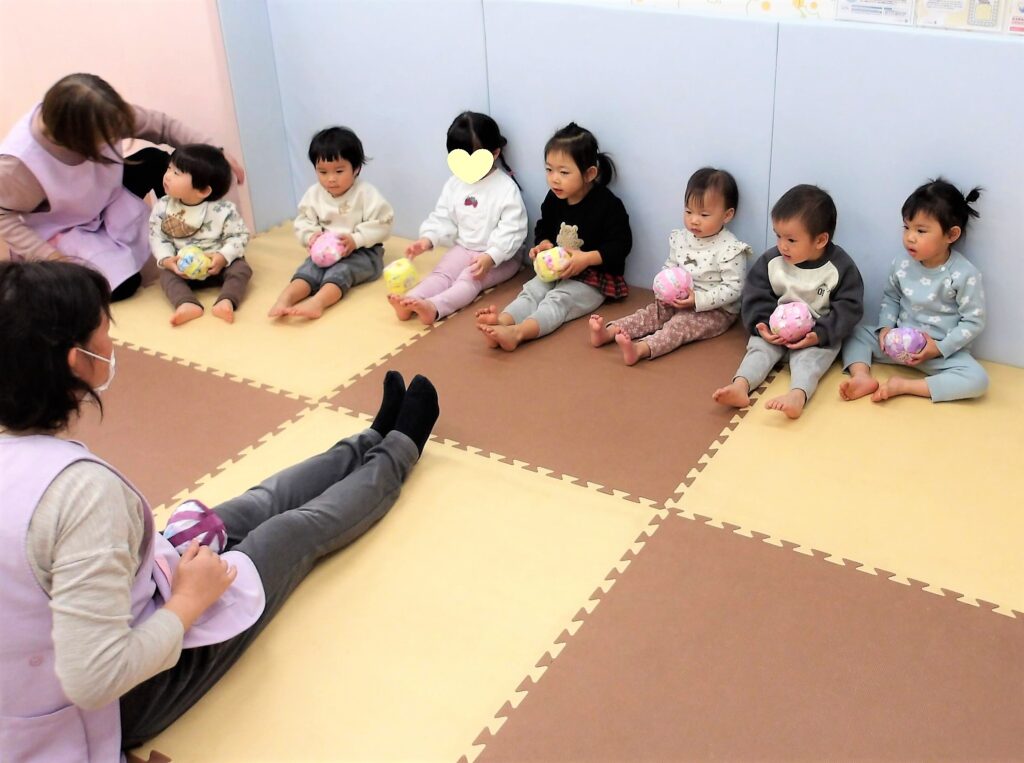 てまり遊びでは、ころころ転がるてまりを目で追い、夢中になって遊ぶ姿が印象的でした。