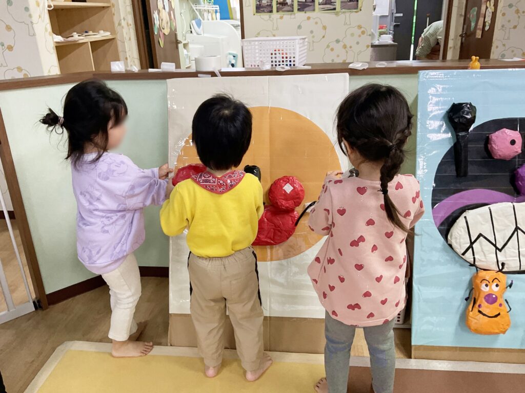保育園に赤鬼と青鬼がやって来ると、子どもたちはアルミカラー豆を投げて元気よく退治しました。
