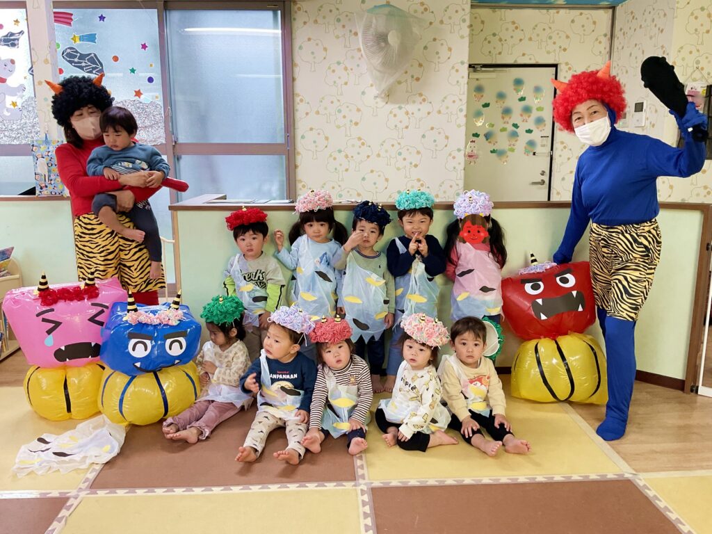 その後は、先生たちによる劇「いたいのいたいの とんでいけ!」を通して鬼たちと仲よくなり、最後はみんなで「鬼のパンツ」を歌いました。笑顔あふれる、楽しい会となりました。