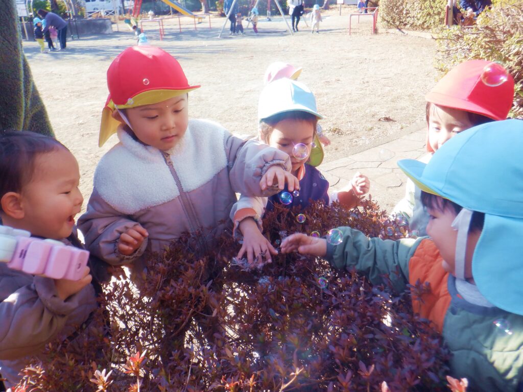 保育園の近くには公園がたくさんあり子どもたちは毎日色々な公園に行き、春夏秋冬の自然を身近に感じながら元気に身体を動かしています。異年齢の子どもたちも兄弟の様に仲良く一緒に遊んでいます。