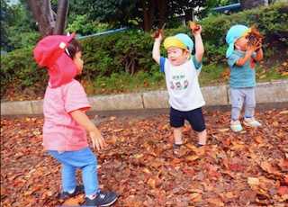 楽しかった水遊びも9月で終了。ようやく安定してお散歩に出られるようになりました♪公園内を元気にかけ回る子ども達は季節の変化を全身で感じているようです。