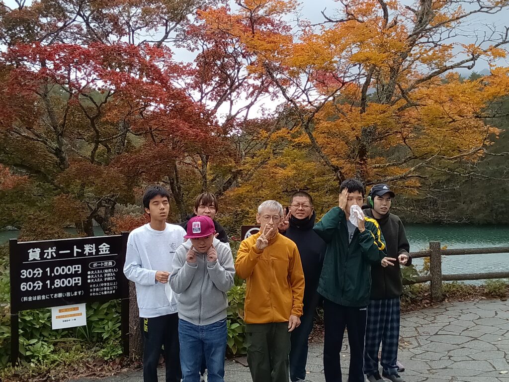 また別の日には、紅葉を見に五色沼へ出かけました。あいにく肌寒く曇りの日でしたが、赤や黄色に色づいた木々が水面に映り、まるで絵のような美しい風景が広がっていました。利用者の皆さまもその景色に見とれながら穏やかな笑顔を見せてくださいました。
