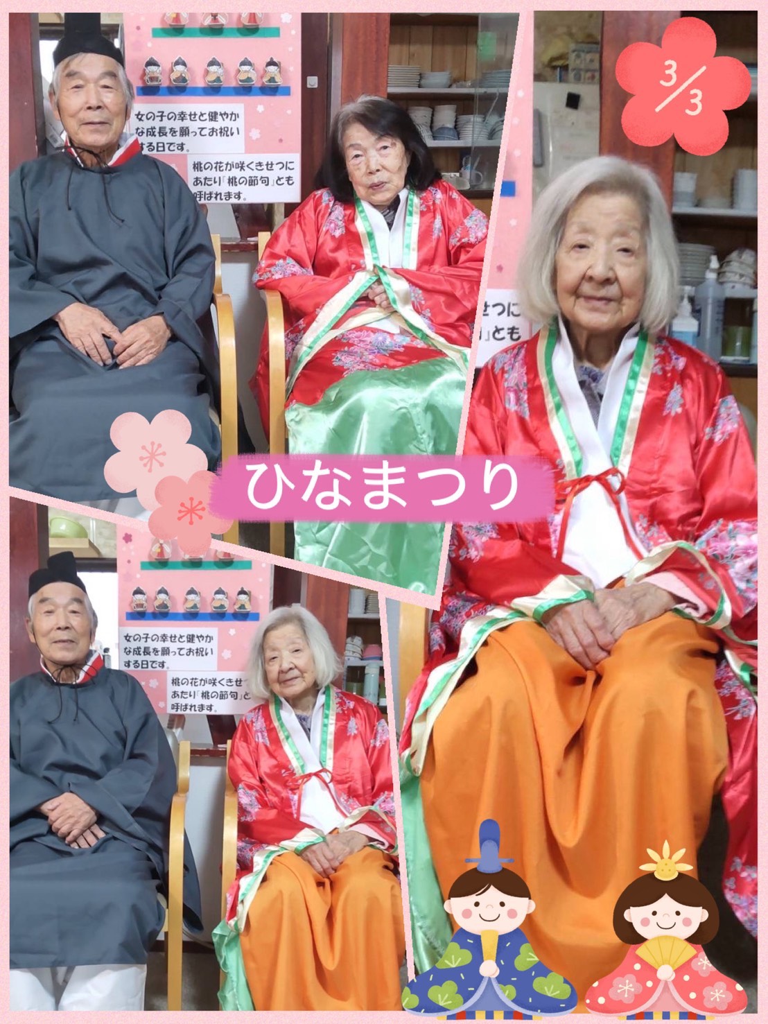 3月3日はひなまつり。利用者様に華やかな衣装を着ていただき、記念撮影を行いました。