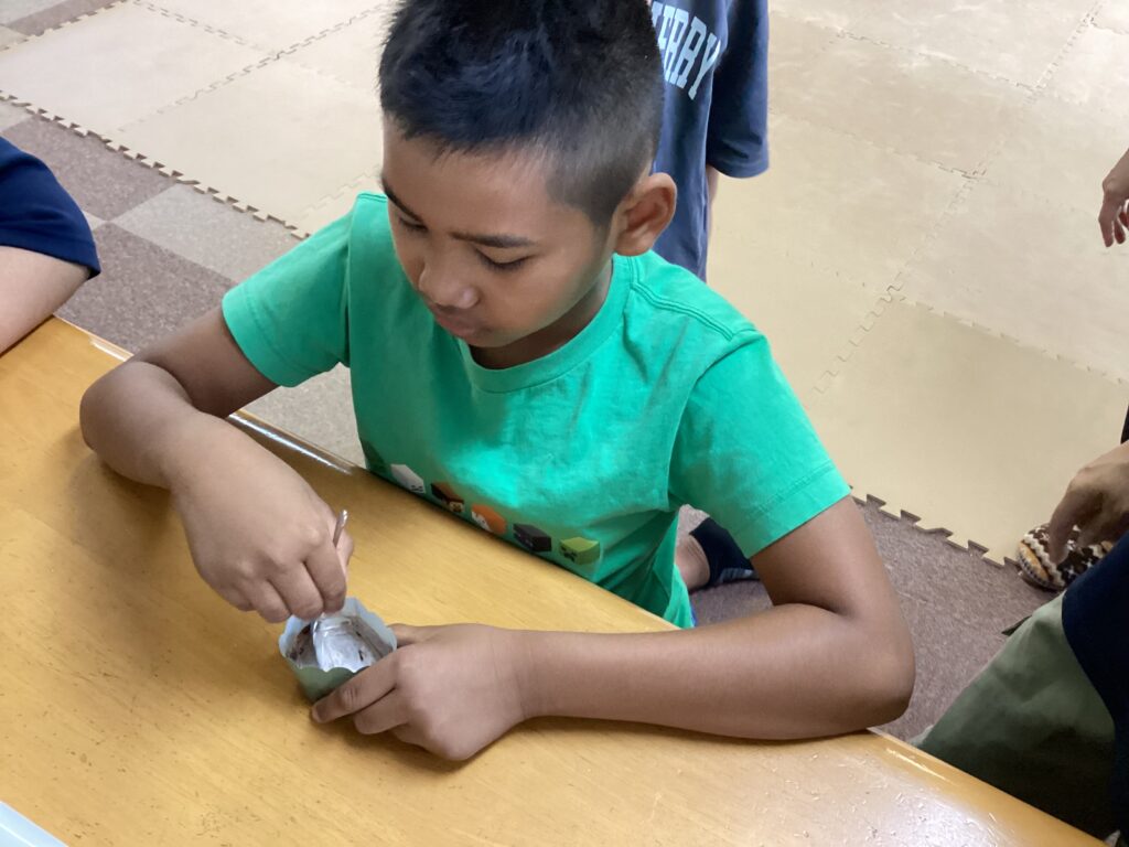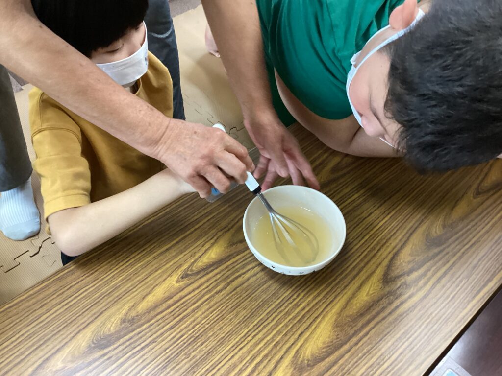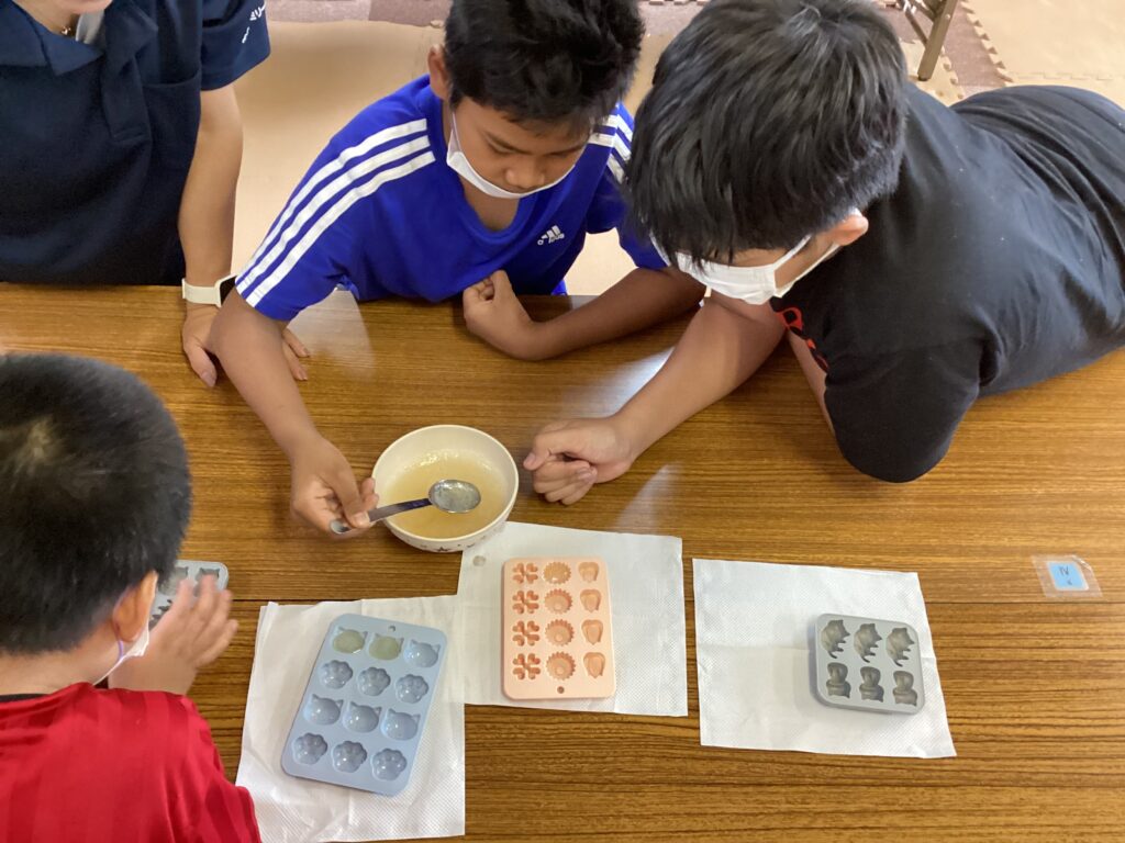 最初の祝日には、初めての試みで、グミ作りに取り組みました。材料は以前のフルーツゼリーとほぼ変わらないものでしたが、仕上がるとしっかりグミになり、子どもたちは大喜び。グループごとに作りましたが、どのグループも大成功でした。