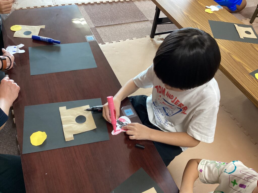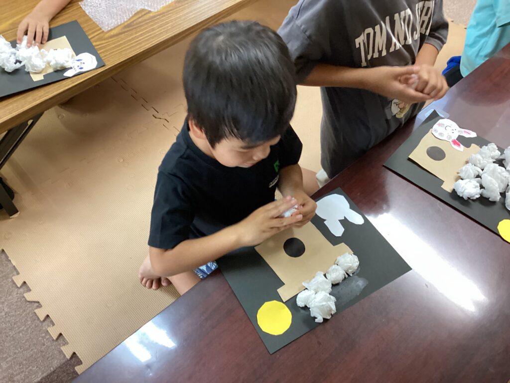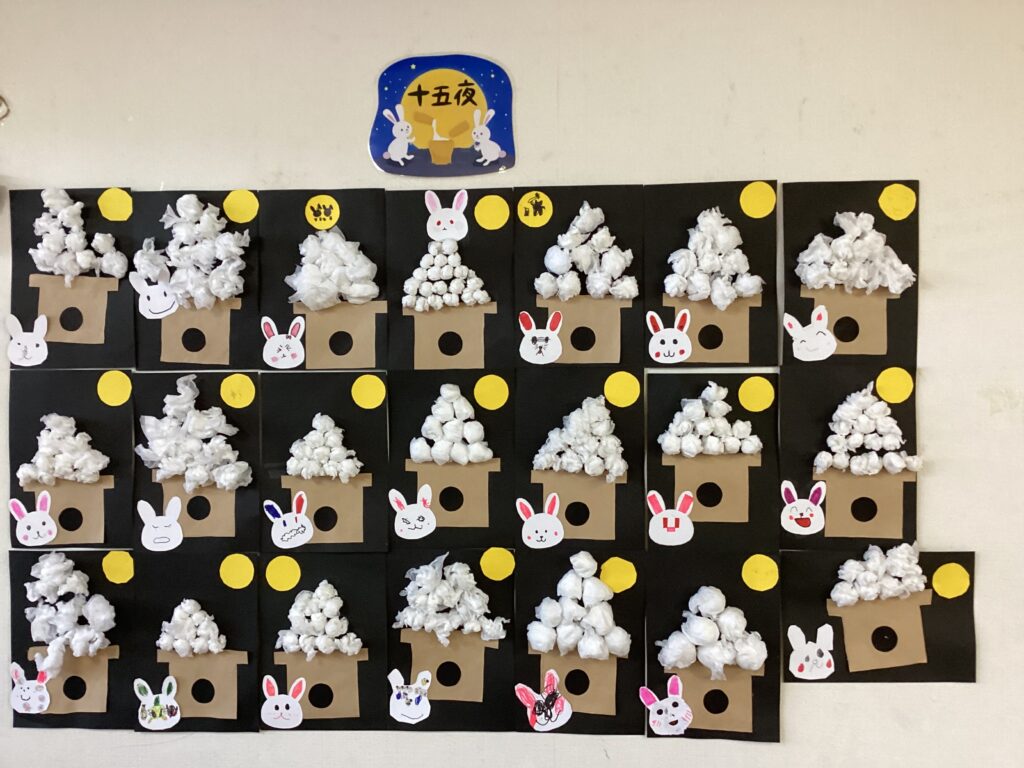 また、季節の制作では「秋といえば十五夜・お月見」ということもあり、画用紙とお花紙を使って月見団子を表現しました。子どもたち一人ひとりの個性が表れた素敵な作品に仕上がりました。