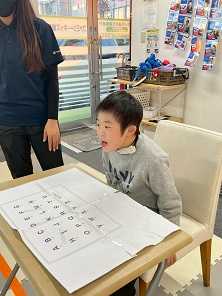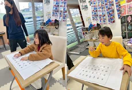 子どもたちは室内でも外でも、さまざまな活動を楽しみました。室内遊びでは、某テレビ番組をヒントにした“迫りくるアルファベットに素早くタッチする”レクリエーションが大盛り上がり。自分の手元の表を見ながら探し当てる姿はとても真剣で、見つけた瞬間にパッと笑顔がはじけるのが印象的でした。