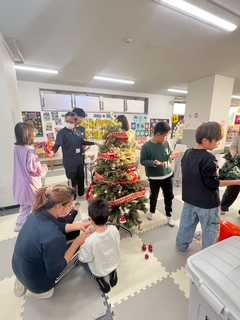 さらに、今月のメインイベントであるクリスマスツリーの飾りつけにも積極的に参加してくれました。飾りを手に取って位置を考えながら飾る姿は、それぞれのセンスが光っていました。館内が一気に華やかになり、子どもたちも満足そうにツリーを眺めていました。