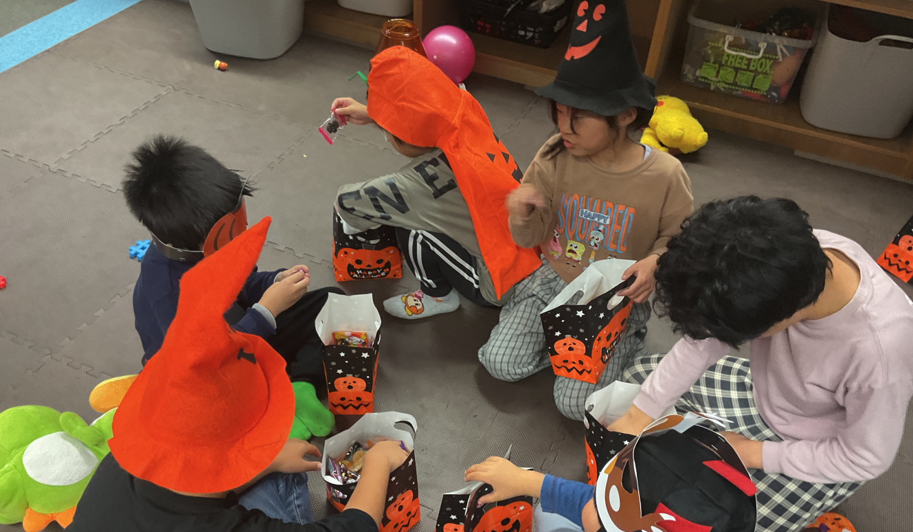 それぞれ思い思いの仮装に身を包み、「トリック・オア・トリート!」と元気いっぱいの声が響き渡り、その後は、みんなで輪になっておやつタイム。笑顔あふれる楽しいひとときを一緒に過ごせました。