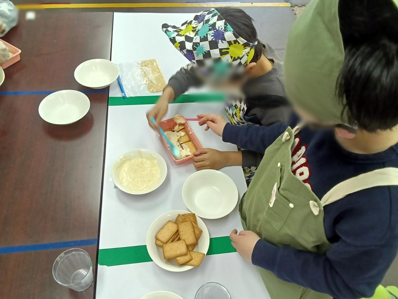 調理活動では、グラハムケーキ作りに挑戦しました。グラハムケーキは、グラハムクラッカーを使った海外でも親しまれているおやつです。今回、クラッカーは他のビスケットを用いての調理となりましたが異文化のお菓子に触れる機会にもなり、子どもたちも興味津々でした。クリームを混ぜたり、ビスケットを重ねたりと、それぞれ役割を持って協力しながら丁寧に作業を進めました。みんなでおいしくいただき、笑顔あふれる時間となりました。