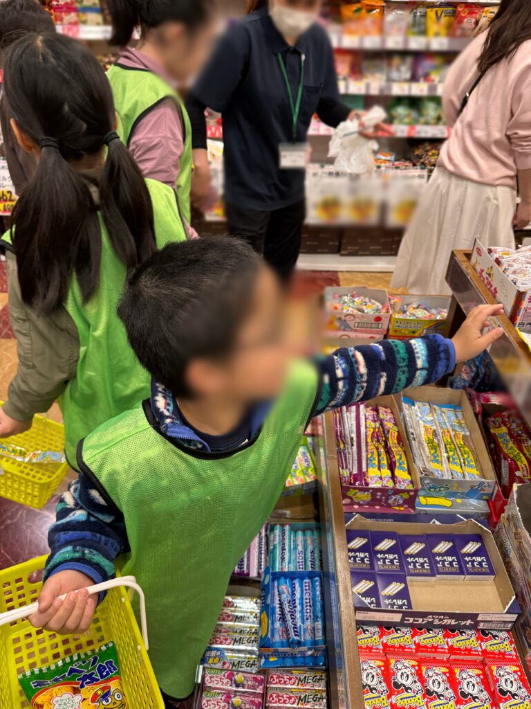 学校がお休みの際にはお買い物体験でおやつのお菓子をみんなで買いに行いました。予算を意識しながら、自分で好きなおやつを選び、金額を確認してレジで支払いをするという一連の流れを体験しました。「これにしようかな」「あといくら買えるかな」「これ食べたいけど買えないな」と考えながら選ぶ姿はとても真剣で、実際の買い物を通して社会性や金銭感覚を学ぶ良い機会となりました。