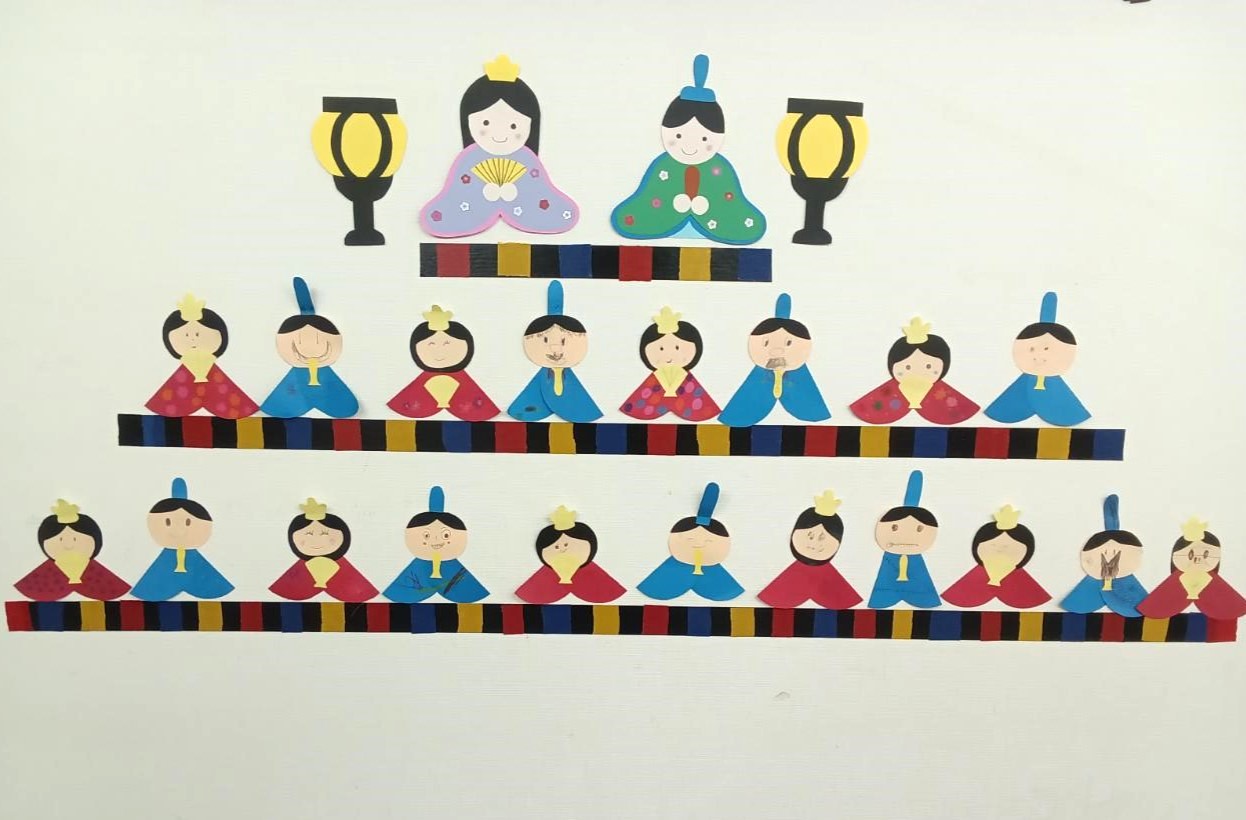 さらに、3月のひな祭りに向けて、室内飾りとしてひな人形制作も行いました。工程ごとに職員の説明をよく聞きながら、一つひとつの作業を丁寧に進める姿が見られました。顔の表情を描き、着物の模様を考え、貼り合わせるなど、細かな作業にも集中して取り組み、それぞれの個性が光る作品が完成しました。飾り付けをすると室内が一気に春らしい雰囲気となり、季節の訪れを感じることができました。