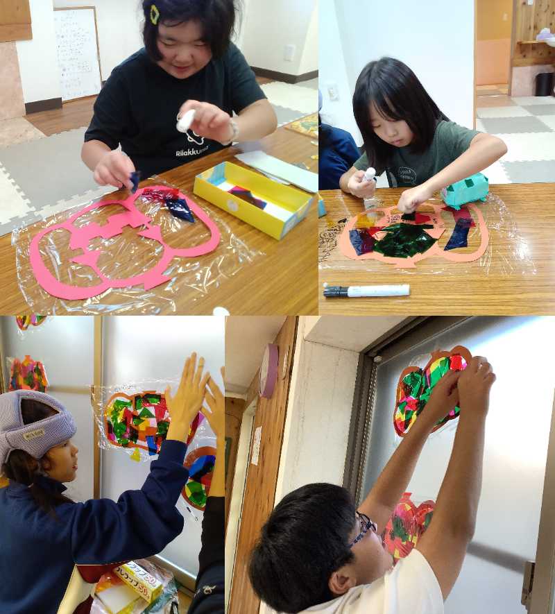 ハロウィンの時期も近づいてきました。カラーセロファンで作ったカボチャ型のステンドグラスで窓が徐々に鮮やかに彩られてきています。