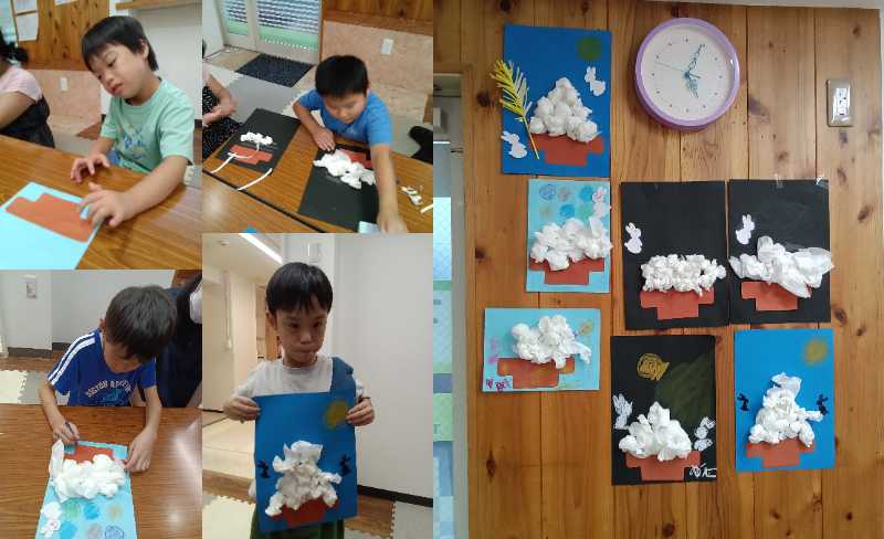 中秋の名月の季節なのでお月見工作をしました。紙をこねて丸めてお団子に見立て台紙に貼って、個性があふれる作品がキッズの壁を華やかにしてくれました。