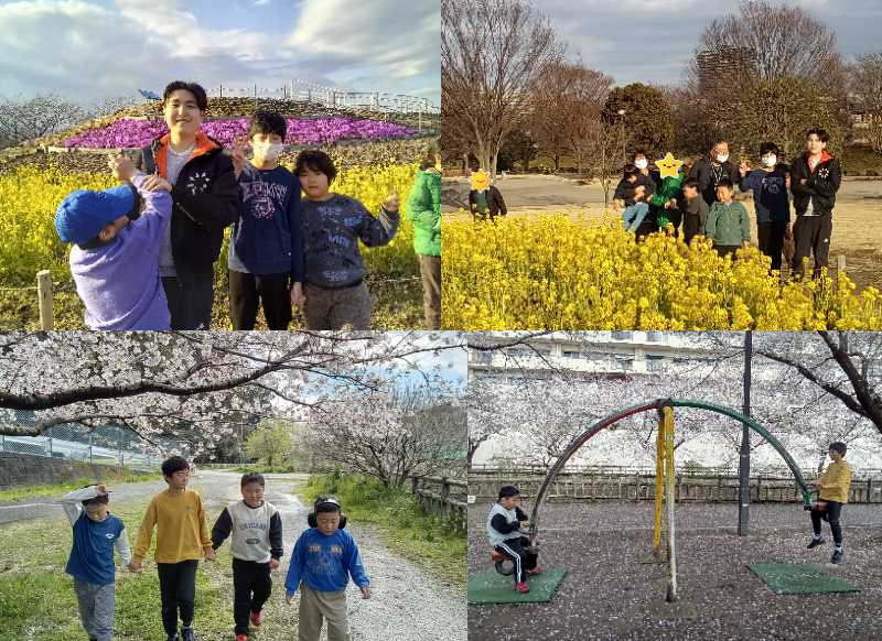 公園でのお出かけでは春の訪れを感じながら、心地よい春風の中、一面の菜の花を眺めたり、満開の桜の下で散歩したり遊具で遊んだりしました。