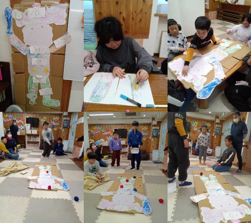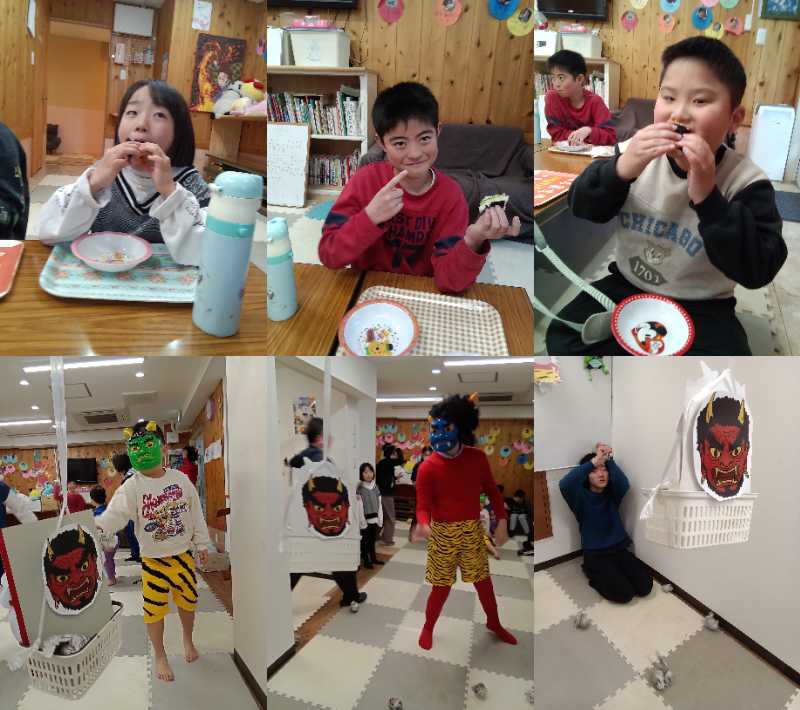 節分では恵方を向いて黙ってかぶりつく作法で恵方巻を食べました。独特の雰囲気に笑いをこらえながらも、作法を守り頬張っていました。恵方巻を食べた後は、鬼を目掛けての玉入れ大会で遊びました。
