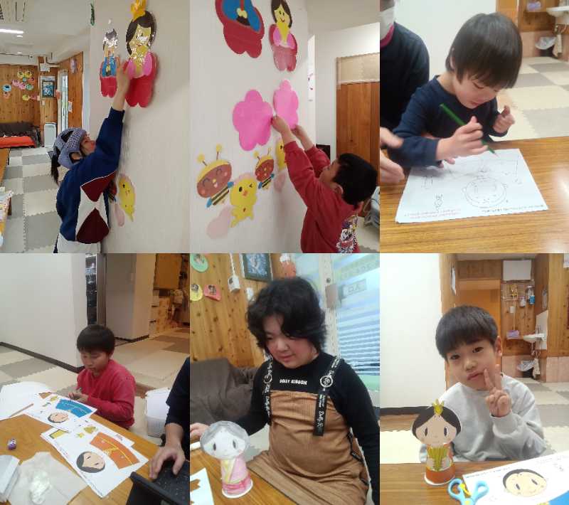 3月に入り、ひな人形工作をしてひな祭りを迎えました。工作では集中して取り組み、自分で作ったひな人形が完成すると優しい表情をみせていました。