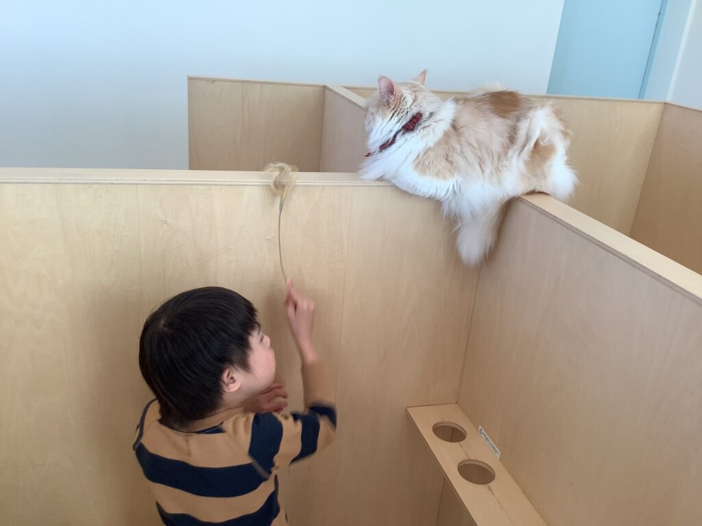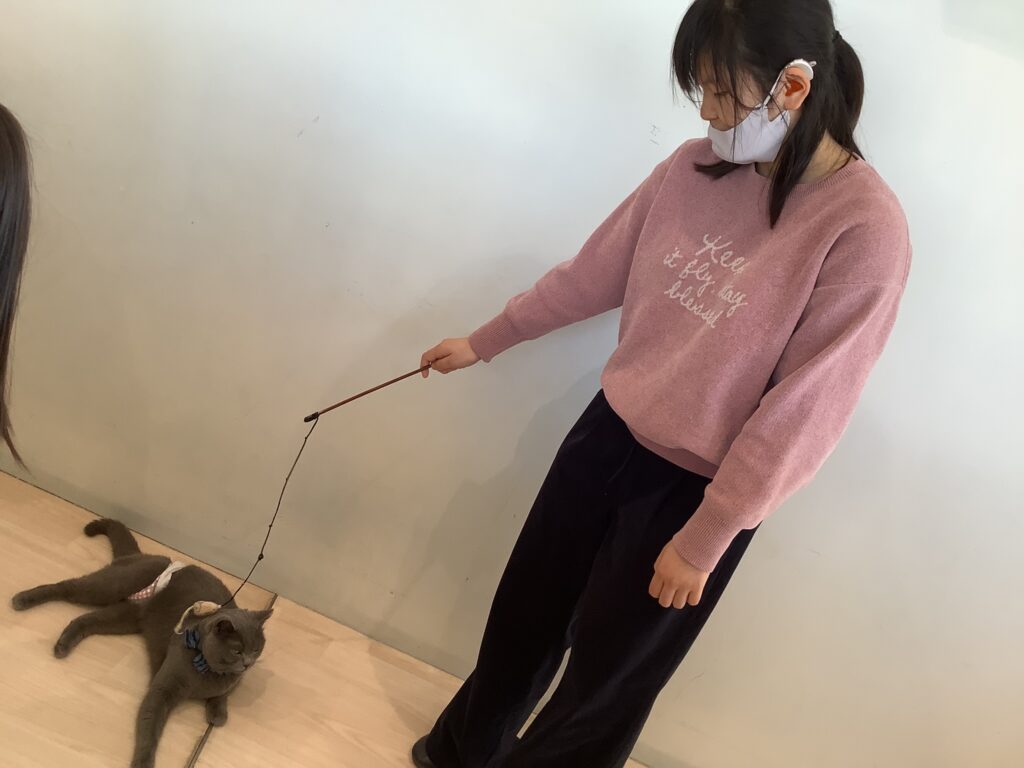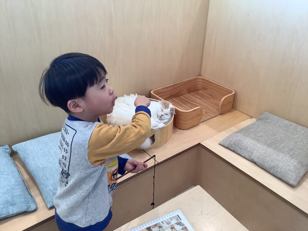 動物と遊ぼう 優しくタッチ・頭をなでなで ネコさんを優しく触って気持ち良さそうに寝ていました。