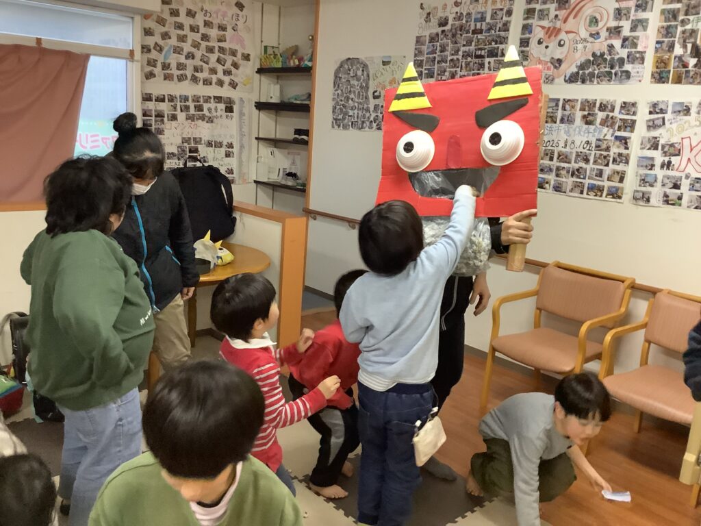 みんなで新聞紙豆を投げて鬼退治!お福さんに豆を当てないように気を付けて!