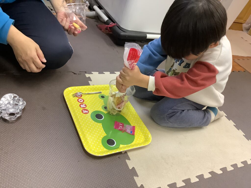 自分でカップにスポンジケーキを入れてクリームをのせてもクッキーとチョコのトッピング。