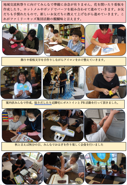 涼風を感じる9月は食欲の秋、恒例の地域交流秋祭りの準備と当日のホスト役となるご利用者さんにコーナーの説明とシュミレーションを通しながら地域の方をお迎えする流れを伝えて行きます。