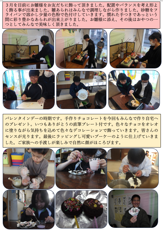 2月はインフルエンザが猛威を振るい、お友だちも休校される方も多く見られました。合わせてキッズのご利用キャンセルも多く見られ個々にお電話で様子をお伺いしました。ご家族の方から子どもはキッズに行きたがっているとのお話を聞くたびに胸が熱くなります。